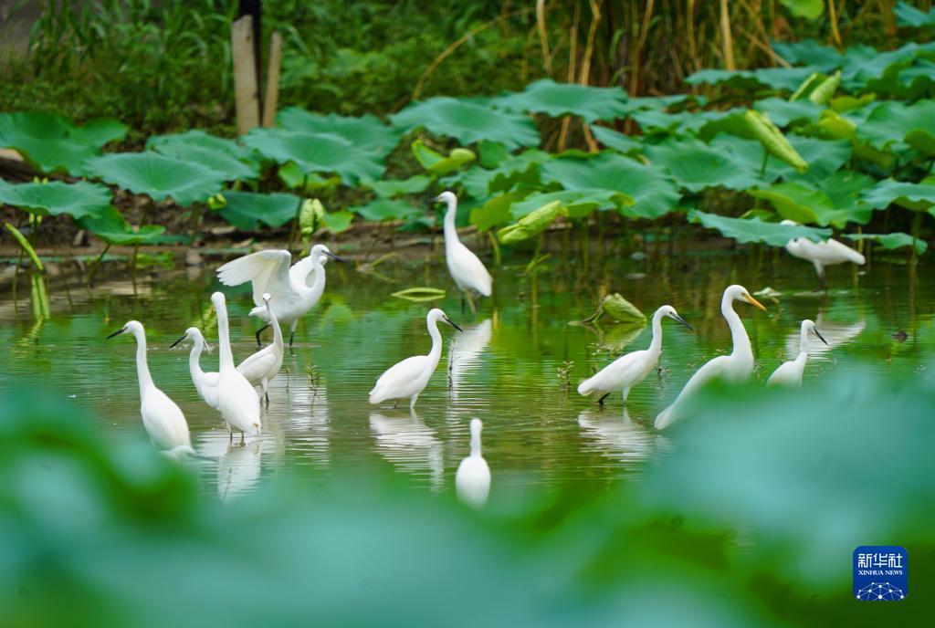 9月2日,在湖北省恩施土家族苗族自治州宣恩縣貢水河國家濕地公園,成群的白鷺在休憩覓食。