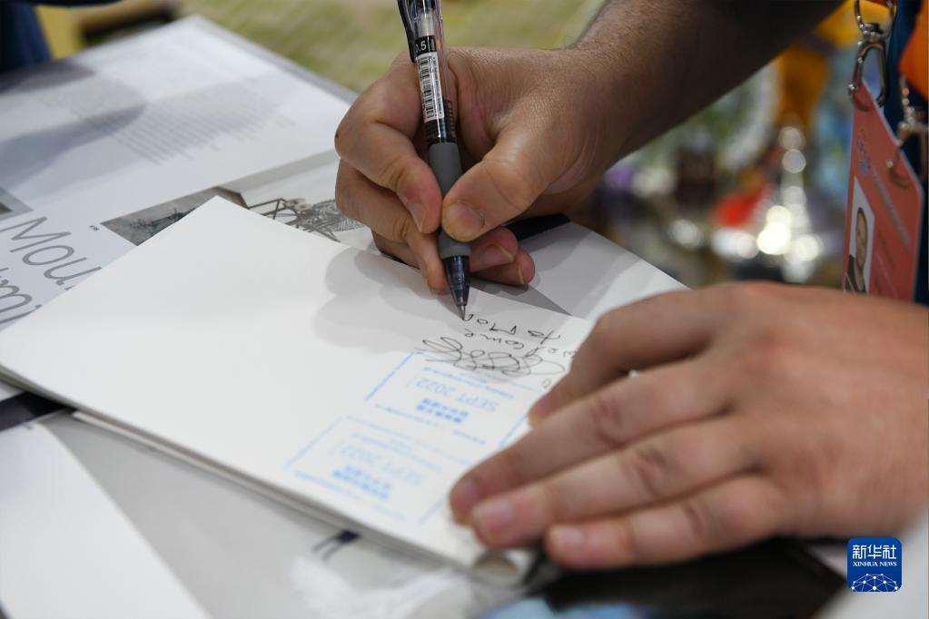 9月4日,在首鋼園區,摩洛哥展臺工作人員為觀眾蓋紀念章并簽名。
