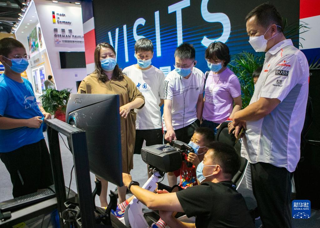 9月3日,參觀者在服貿會國家會議中心展館國別展區英國展臺體驗虛擬賽車駕駛游戲。