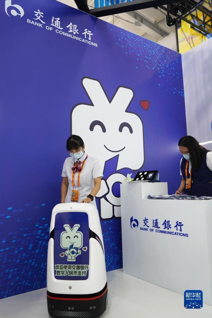 9月4日,在服貿會首鋼園區金融服務專題展上,一位交通銀行工作人員操作數字人民幣支付智能機器人。 新華社記者 金皓原 攝