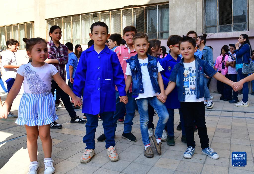 9月4日,敘利亞大馬士革一所學校的學生站在校園里。