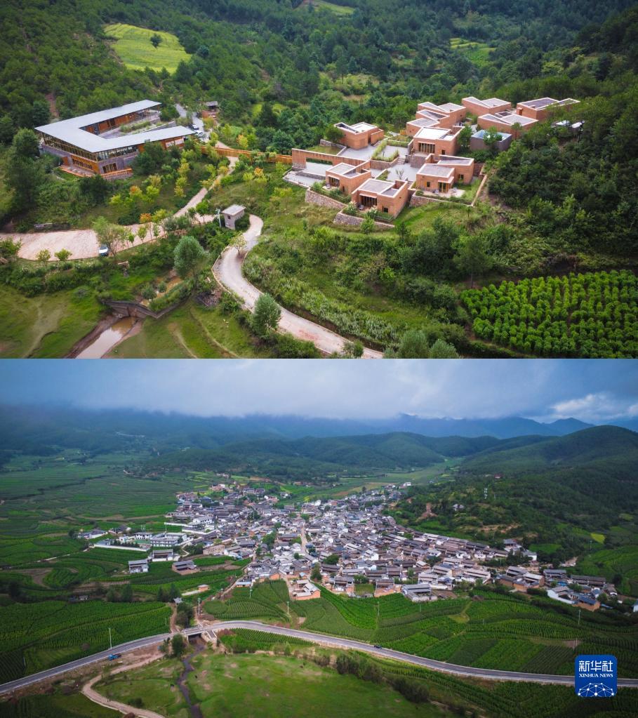 拼版照片:上圖為位于云南省沙溪鎮石龍村的喜林苑沙溪店(8月31日攝,無人機照片);下圖為喜林苑沙溪店所在的石龍村(8月31日攝,無人機照片)。