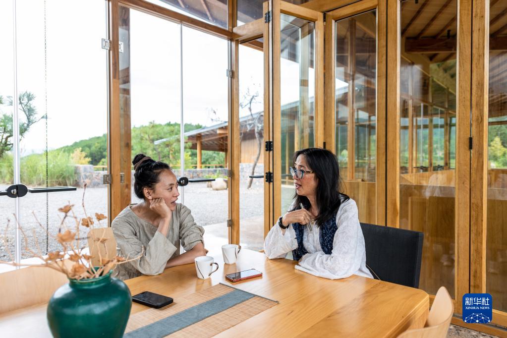 8月31日,林登的妻子瑾妮(右)向當地舞蹈家董繼蘭學習白族話。