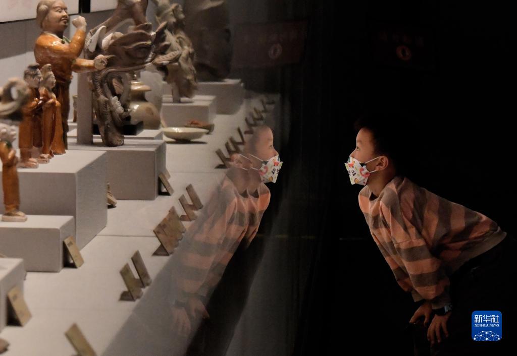 9月4日,一名小朋友在“文明的淵藪——河南百年百大考古發現展”上觀看展品。