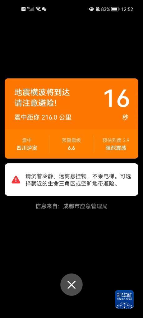 這是成都市民手機接收到的地震預警截圖(9月5日攝)。