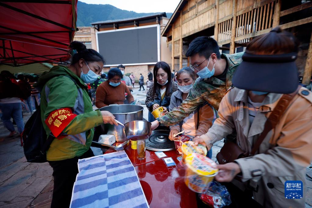 9月5日,在四川甘孜州瀘定縣磨西鎮,工作人員發放熱水和方便面。