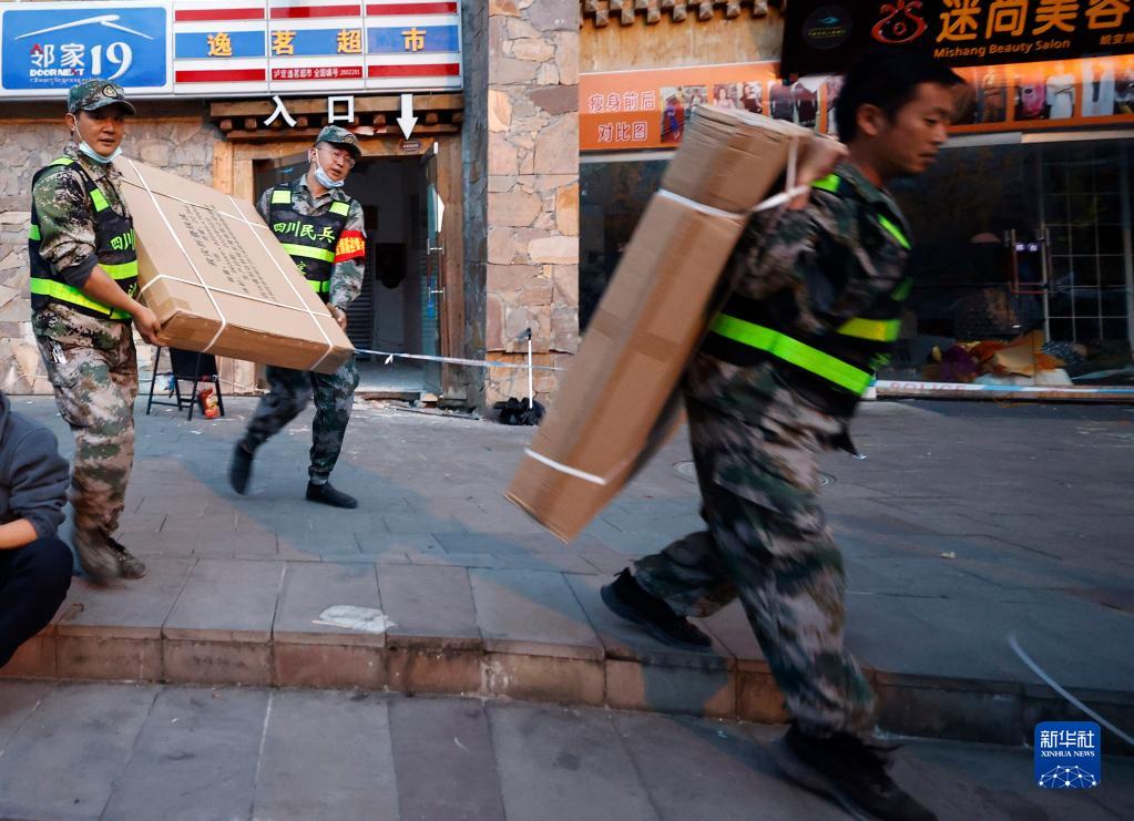 9月5日,在四川甘孜州瀘定縣磨西鎮,救援人員在搬運物資。