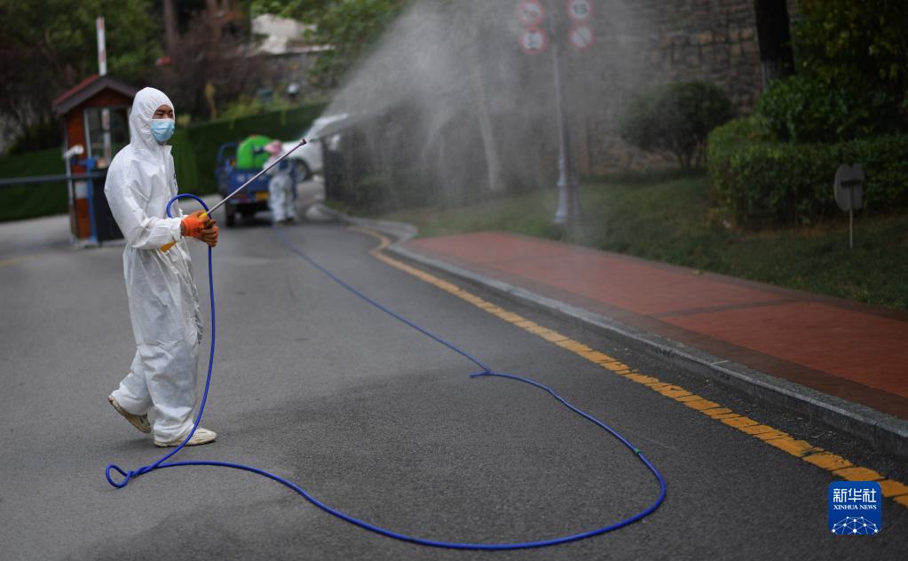 9月5日,志愿者在貴陽市烏當區新光路街道一居民小區核酸篩查點進行消殺作業。