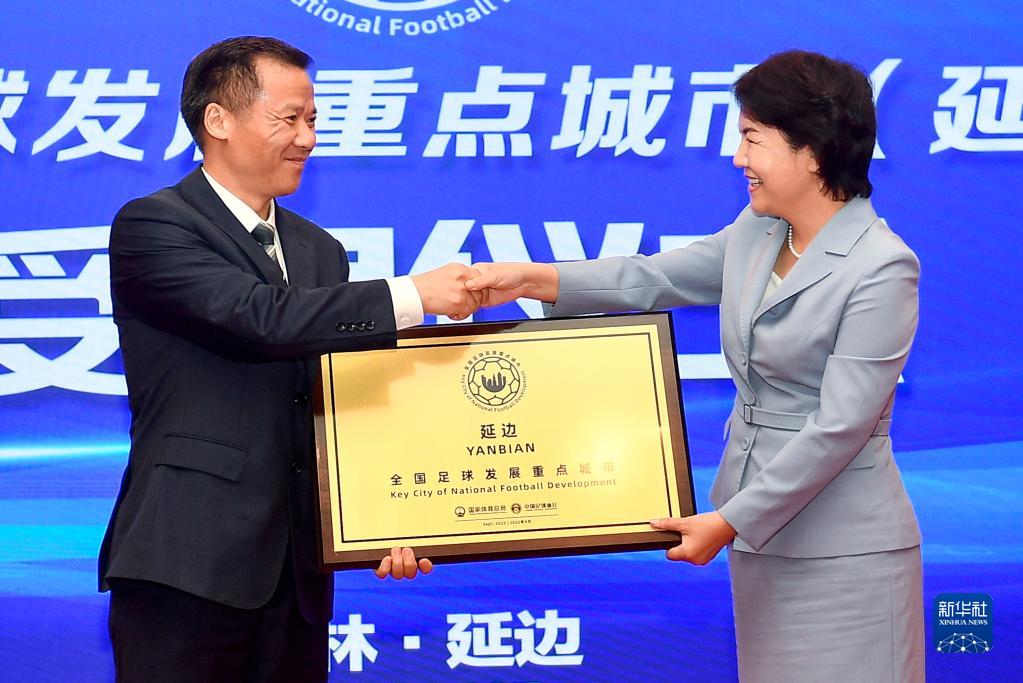 中國足球協會副秘書長何璽(左)與延邊朝鮮族自治州副州長尹朝暉在全國足球發展重點城市(延邊)授牌儀式上(9月3日攝)。