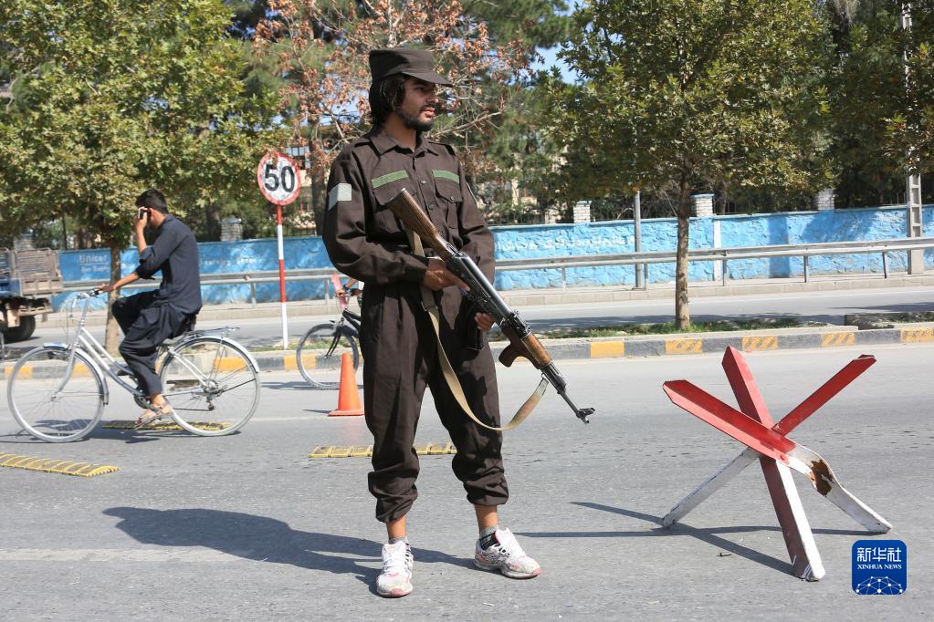 9月5日,阿富汗安全人員在喀布爾爆炸現場附近警戒。