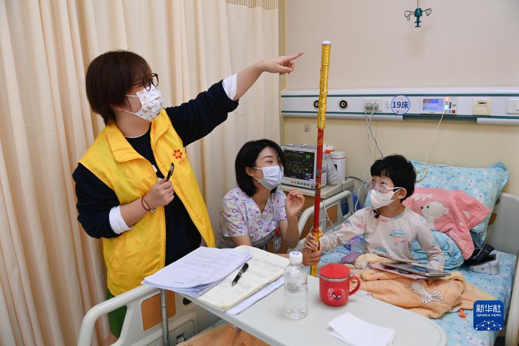 “病房學?!笔潜本┬玛柟獯壬苹饡_展的公益項目,通過在醫院內或附近設立教室,組織教師和志愿者給長期住院的大病兒童上課,教他們做手工、繪畫?!安》繉W?!表椖坑?012年啟動,截至目前在全國18個?。▍^、市)有38間病房學校教室,累計服務患兒超過11萬人次。新華社記者 蔡湘鑫 攝