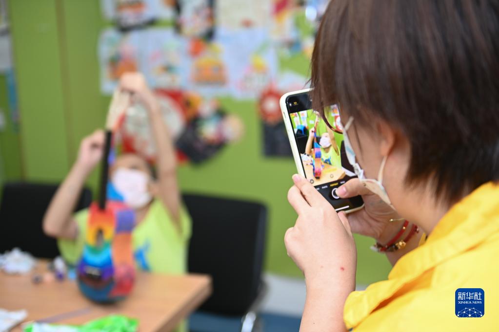 8月30日,在北京高博博仁醫院的“病房學?!眱?,教師施邸昕為參加手工課的小朋友拍照留念。