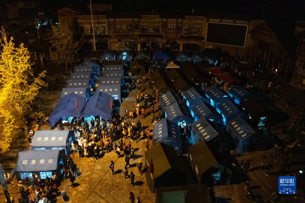 9月5日晚在四川甘孜州瀘定縣磨西鎮拍攝的受災群眾臨時安置點(無人機照片)。