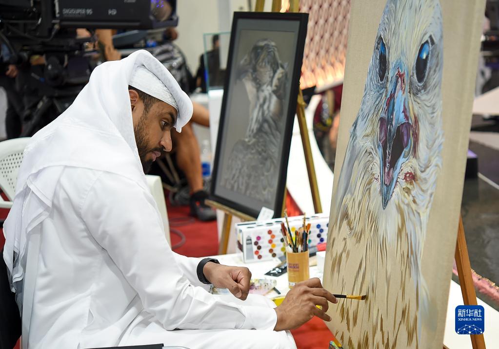 9月5日,一名畫家在卡塔爾多哈的國際狩獵和獵鷹展上作畫。