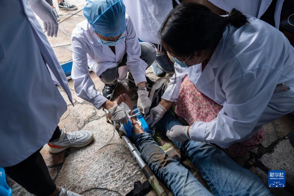 9月6日,在四川甘孜州瀘定縣磨西鎮海螺溝廣場受災群眾臨時安置點,醫護人員為傷員包扎。