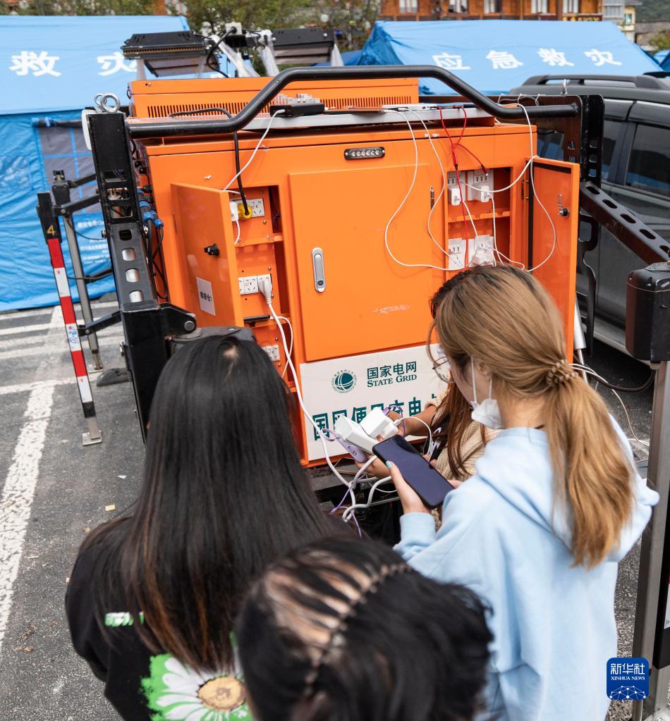 9月6日,在四川甘孜州瀘定縣磨西鎮海螺溝廣場受災群眾臨時安置點,人們在國網便民充電點為手機充電。