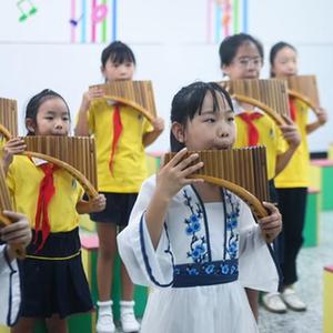 9月6日,杭州市舜天樂器廠的排簫藝人郭新明在給板橋鎮板橋小學的學生上排簫課。該校結合當地竹笛樂器廠資源豐富的特點,開設了排簫課、葫蘆絲課、竹笛課等,引導孩子們學習和傳承中國傳統樂器。
