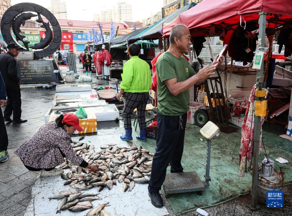 9月4日,在撫遠市東極魚市,一名市民掃碼支付購魚費用。