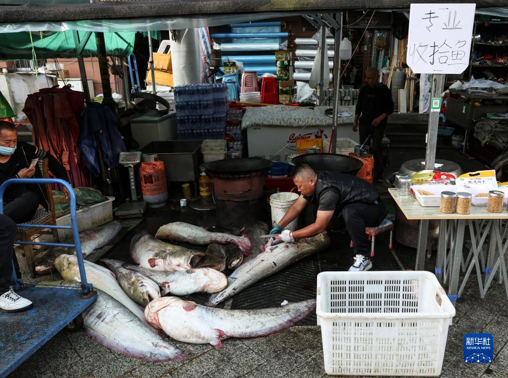 9月4日,在撫遠市東極魚市,一名魚商處理送來的魚。