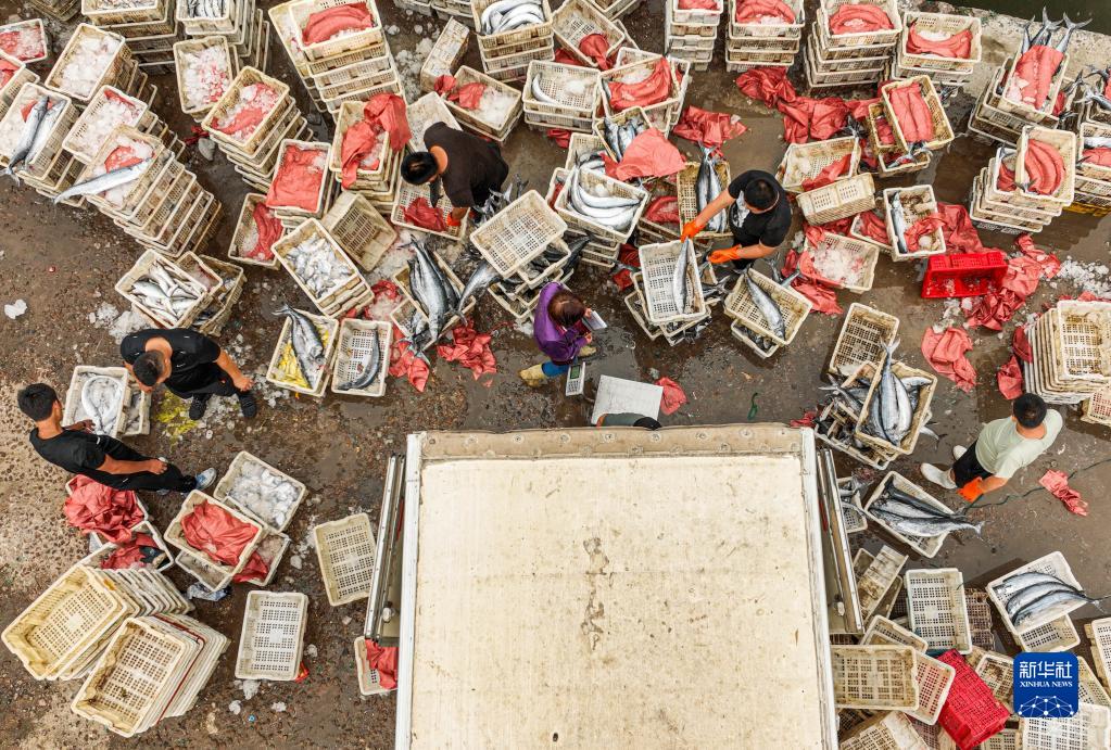9月5日,在山東省榮成市石島漁港碼頭,漁民們分揀、裝運各類漁獲(無人機照片)。