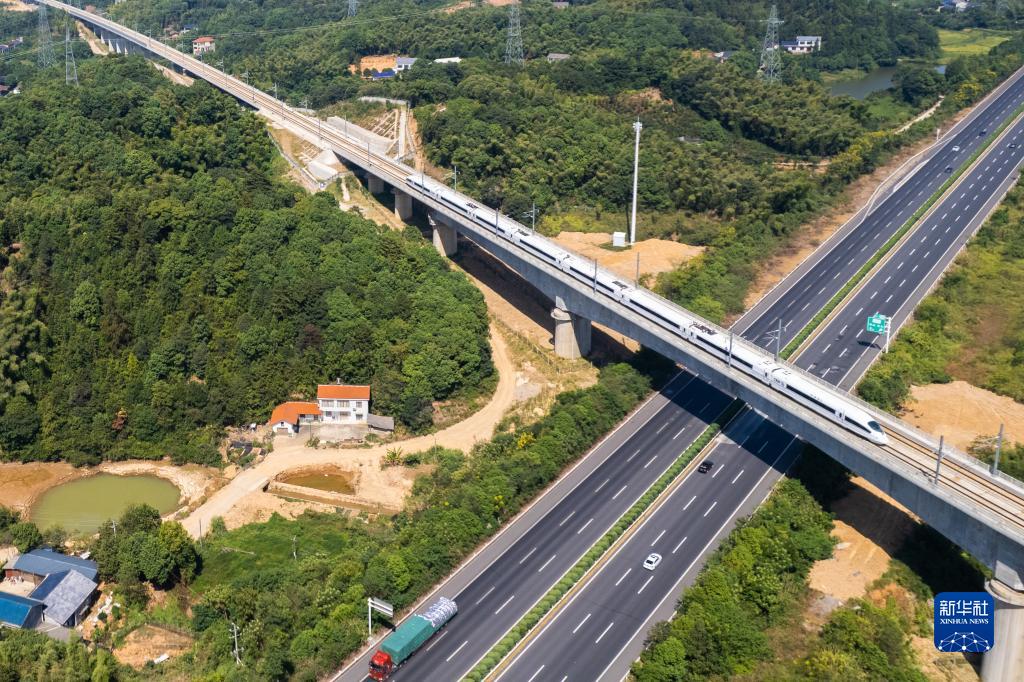 9月6日,高鐵列車行駛在渝廈高鐵益長段跨岳臨高速特大橋上(無人機照片)。