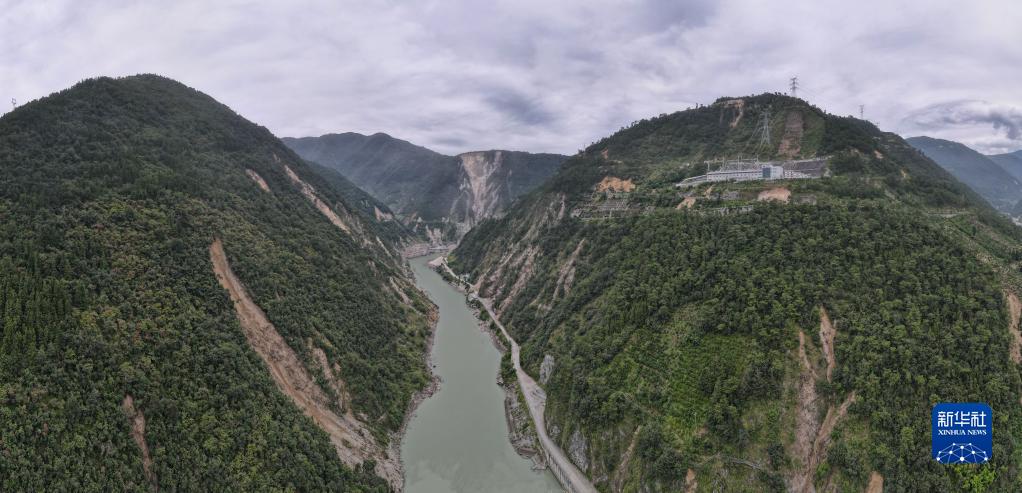 這是9月6日拍攝的石棉縣王崗坪鄉與瀘定縣之間的公路,部分路段出現塌方(無人機照片)。