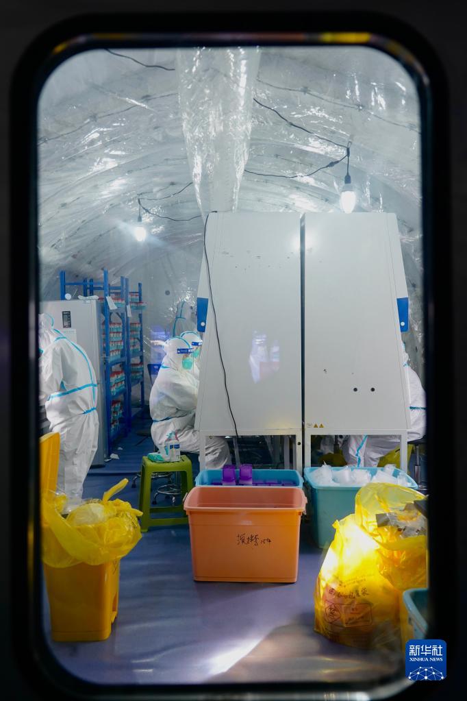 9月5日,核酸檢測隊工作人員在氣膜方艙實驗室內的標本制備區處理樣本。