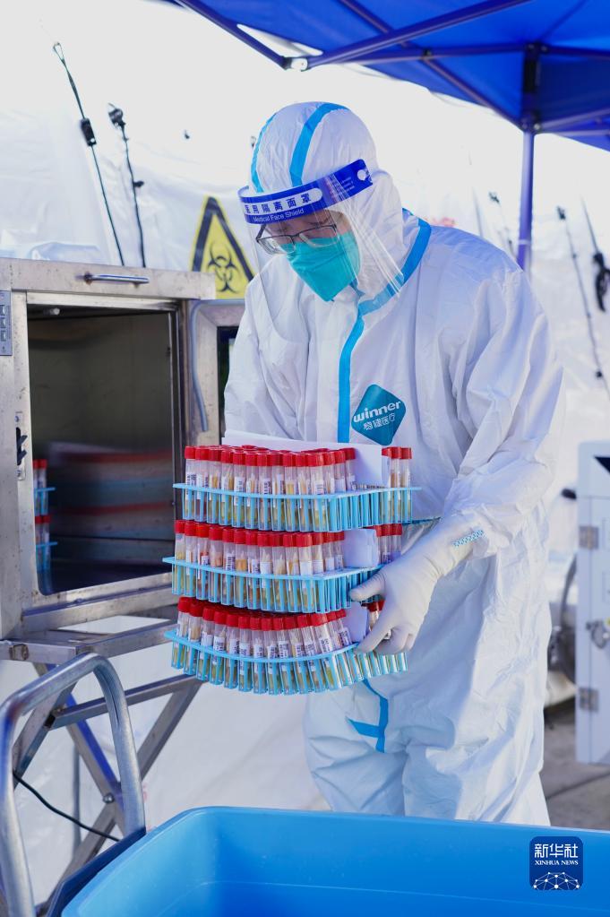 9月5日,氣膜方艙實驗室的核酸檢測隊工作人員對已檢測標本進行轉運處理。
