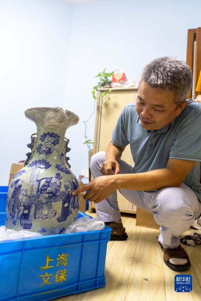 8月23日,上海市文物保護研究中心副主任翟楊介紹長江口二號古船出水文物——清同治景德鎮窯豆青地堆白青花松下高士圖雙耳瓶。