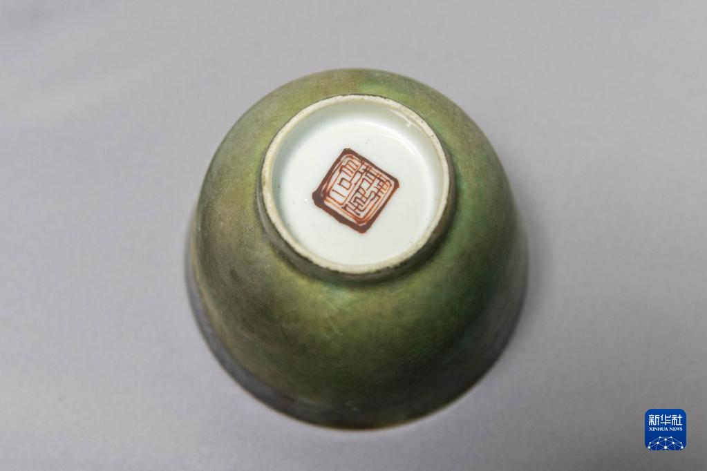 8月23日拍攝的長江口二號古船出水文物綠釉杯,底部有礬紅彩書“同治年制”篆書款識。