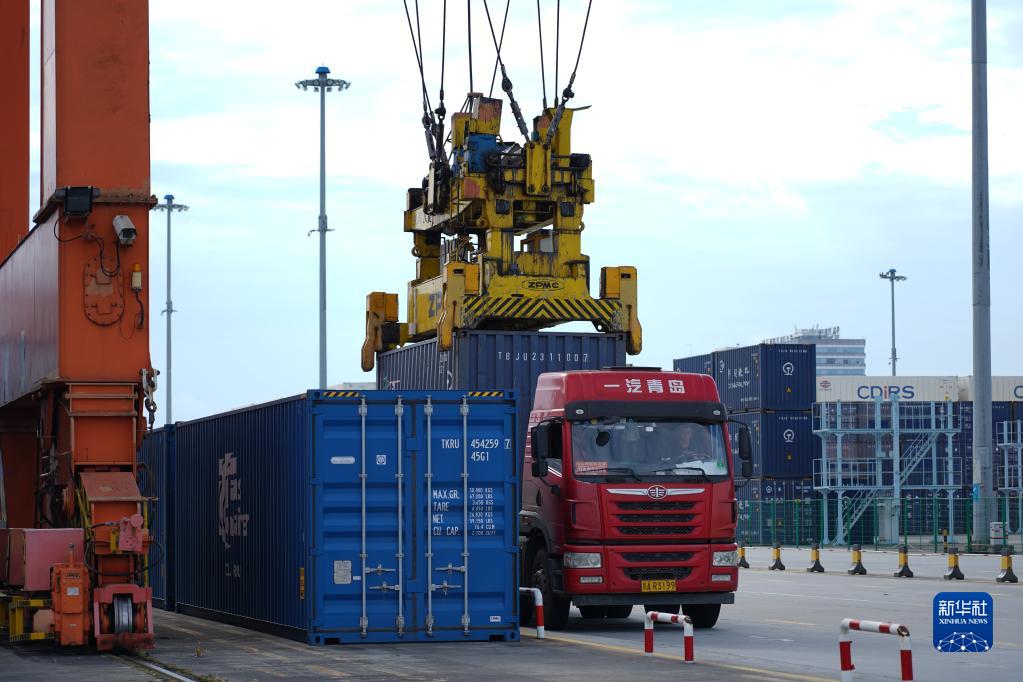 9月3日,貨車司機在成都鐵路集裝箱中心站內裝卸集裝箱。