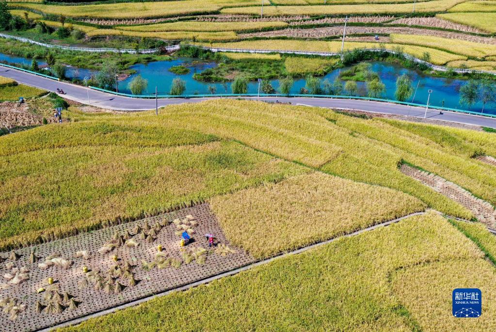 9月6日,貴州省銅仁市玉屏侗族自治縣朱家場鎮混寨村的村民在收獲稻谷(無人機照片)。