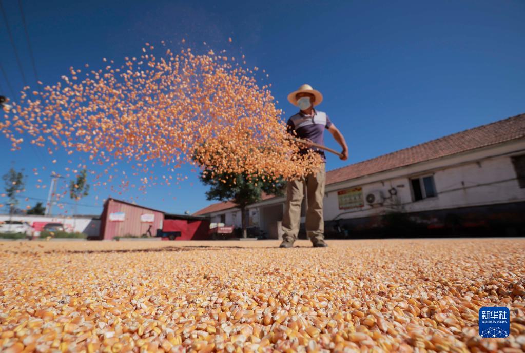 9月6日,河北省遵化市崔家莊鎮大柳樹村的農民在場院晾曬玉米。