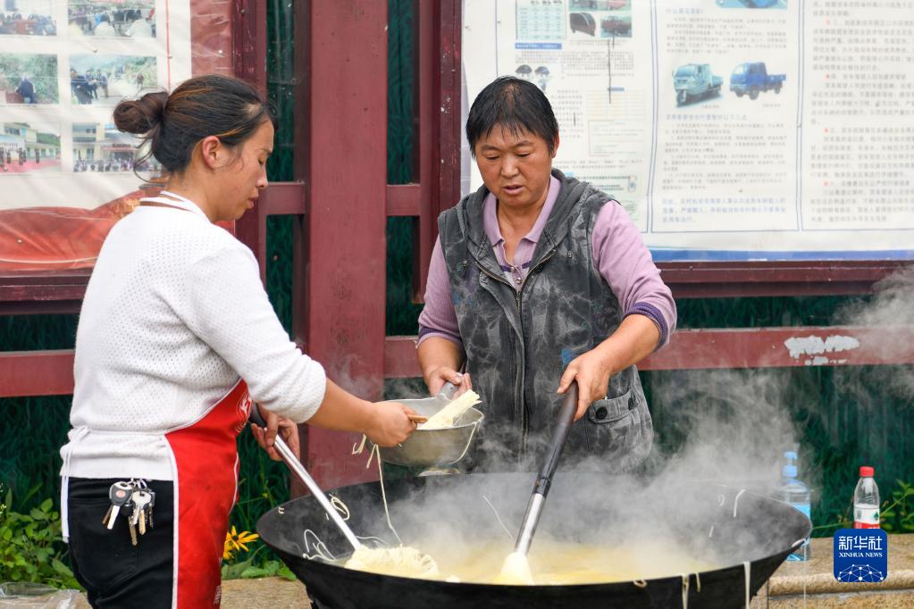 當日,在位于四川省雅安市石棉縣王崗坪鄉挖角村村委會的安置點,村民在安置點內架起鍋灶,生火做飯,為安置點里的鄰里鄉親準備餐食。