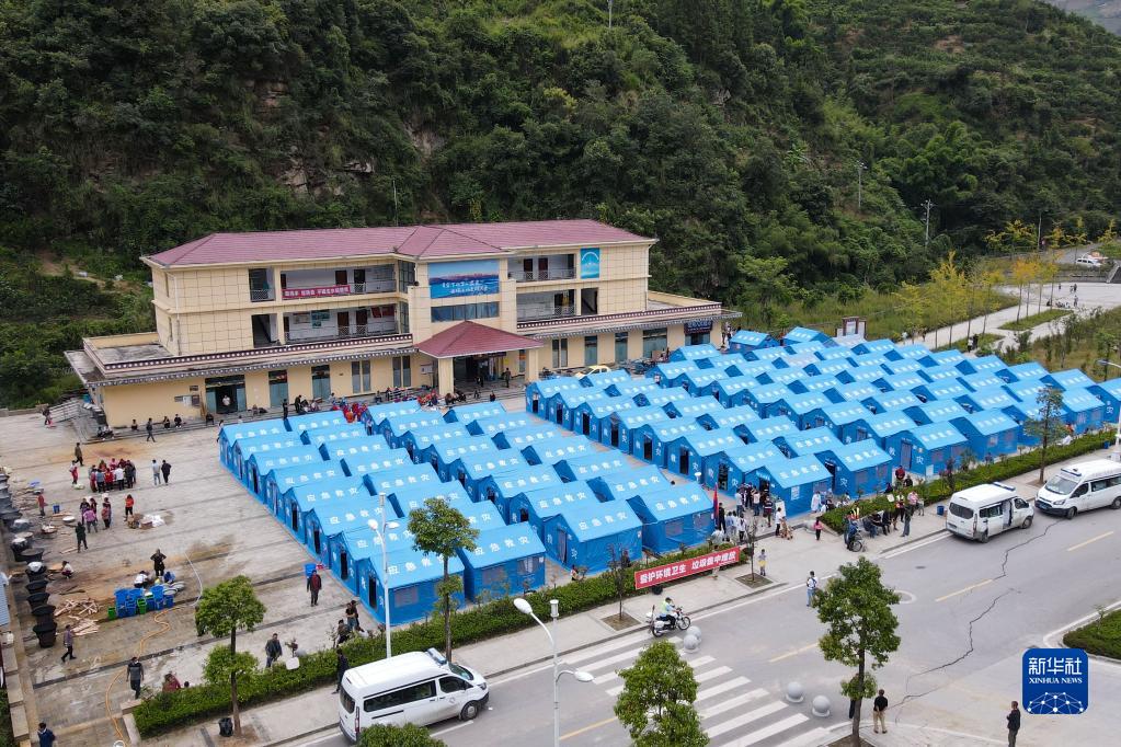 這是9月6日拍攝的位于石棉縣王崗坪鄉挖角村村委會的安置點(無人機照片)。