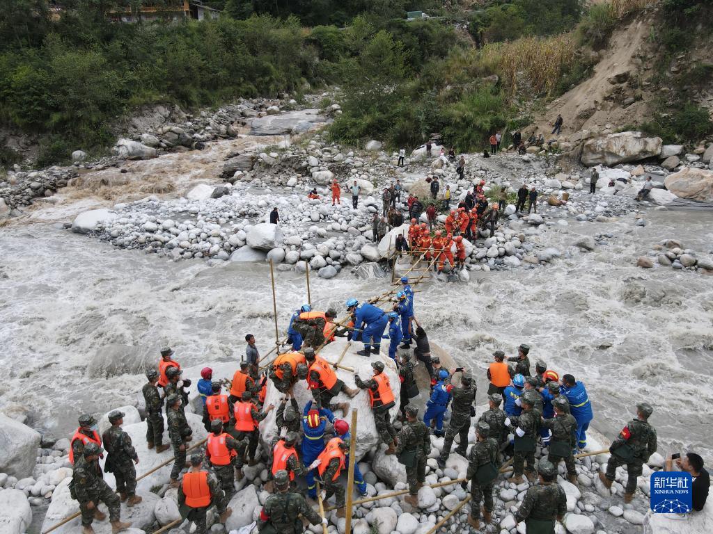 9月6日,武警四川總隊甘孜支隊救援官兵在瀘定縣磨西鎮燕子溝河谷,與多方救援力量一起搭建通往磨子溝村的橋梁。新華社發(葉小龍 攝)