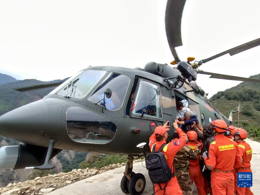 9月6日,陸軍第77集團軍某陸航旅出動直升機在瀘定縣轉移受傷人員。新華社發(趙云橋 攝)