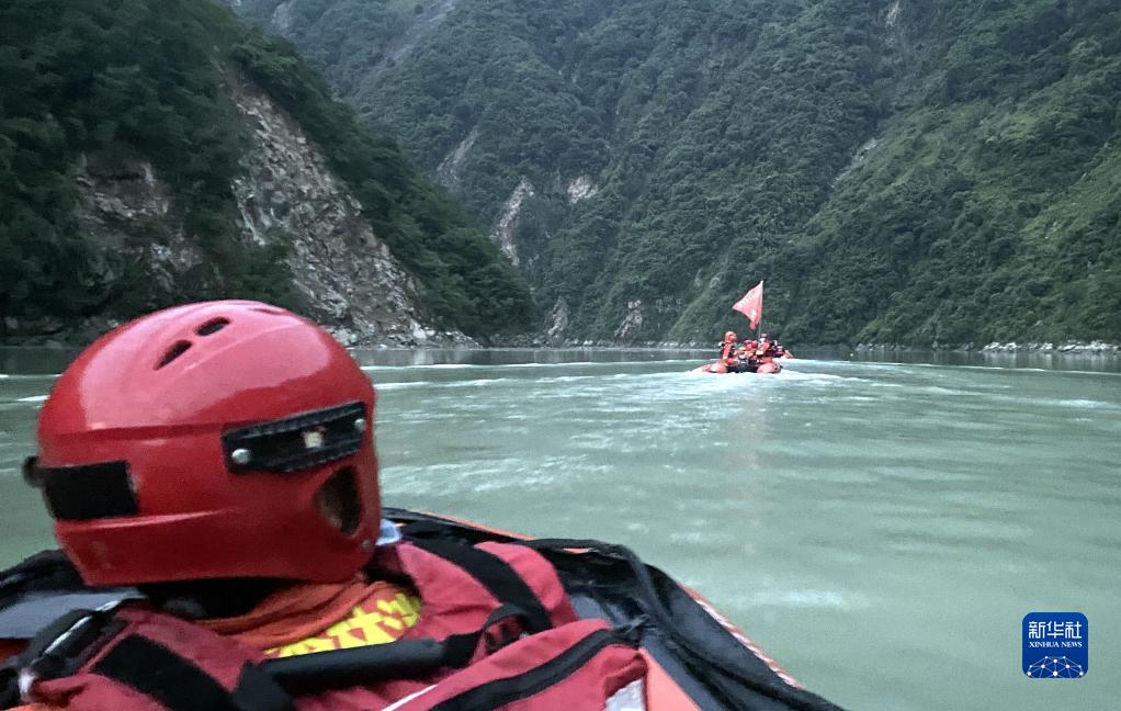 9月6日,四川森林消防總隊甘孜支隊消防員乘橡皮艇進入瀘定縣得妥鎮紫雅場村。