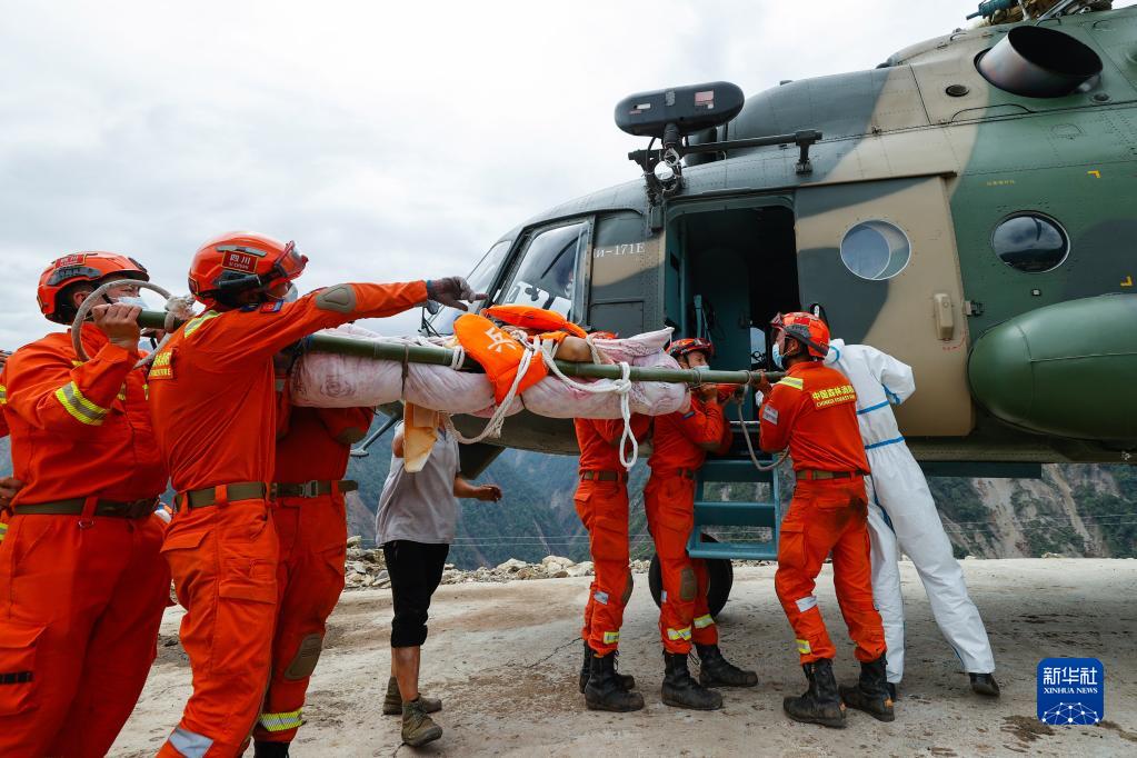 9月6日,救援人員抬著一名從瀘定縣得妥鎮灣東村疏散出來的受傷村民,準備通過直升機將其運出。