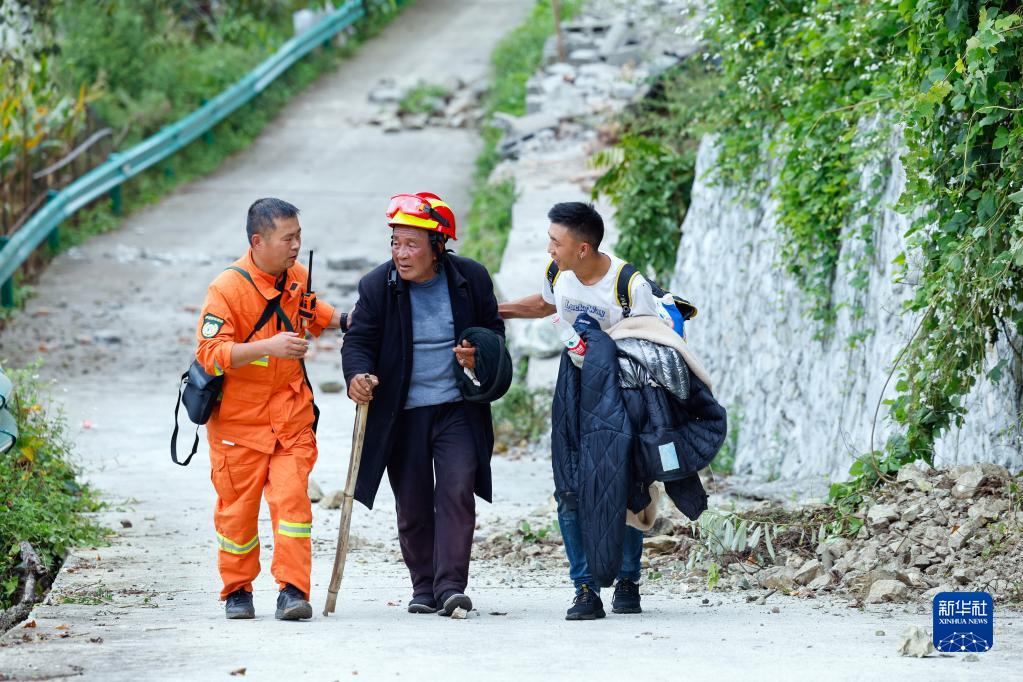 9月6日,救援人員護送從瀘定縣得妥鎮灣東村疏散出來的村民。