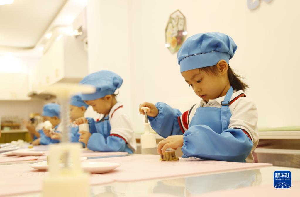 9月6日,河北省邢臺市襄都區第七幼兒園的小朋友在“學做中秋月餅 體驗傳統文化”主題活動中學習制作月餅。