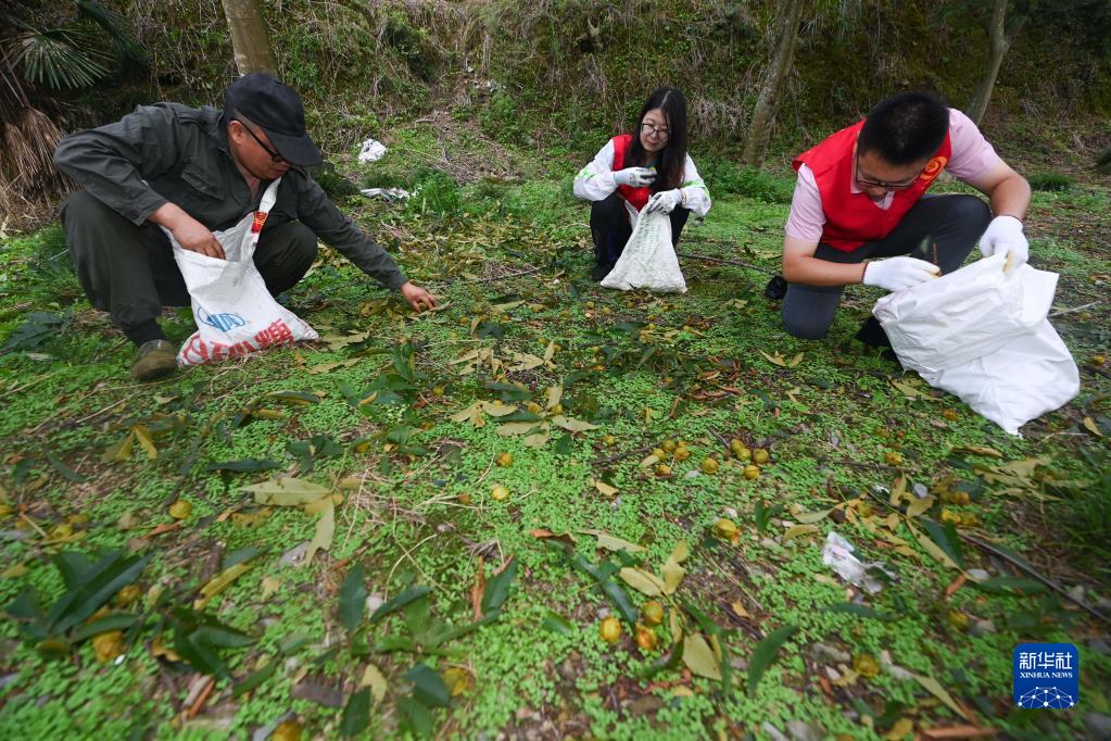 9月7日,在淳安縣臨岐鎮審嶺腳村的山核桃林中,黨員志愿者幫助農戶采收山核桃果。