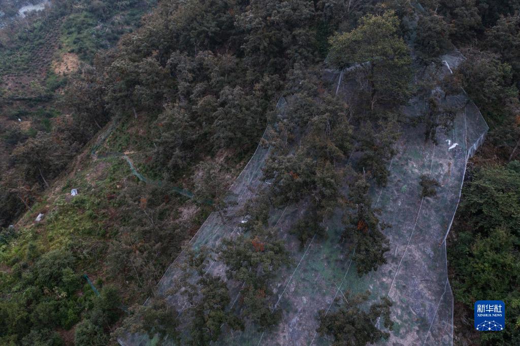 9月7日,空中俯瞰群山中的淳安縣臨岐鎮審嶺腳村,山林中種植了大批山核桃樹,樹下鋪了大片的采收網(無人機照片)。