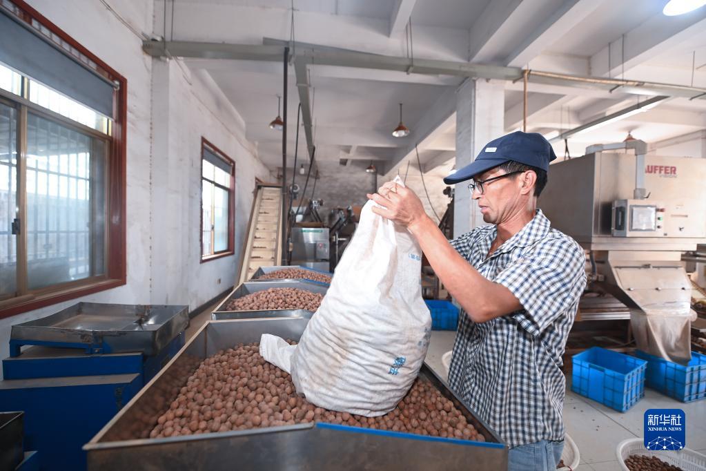 9月7日,在淳安縣臨岐鎮的山核桃“共富工坊”加工企業內,當地村民加工剛采收的山核桃。