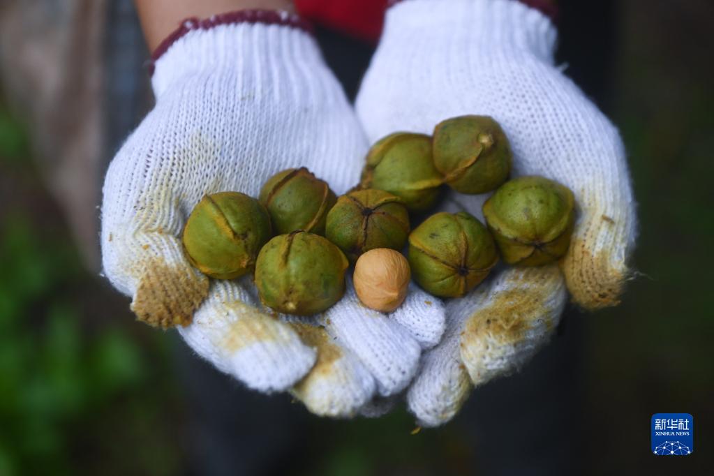 9月7日,淳安縣臨岐鎮審嶺腳村的農戶展示采收的山核桃果。