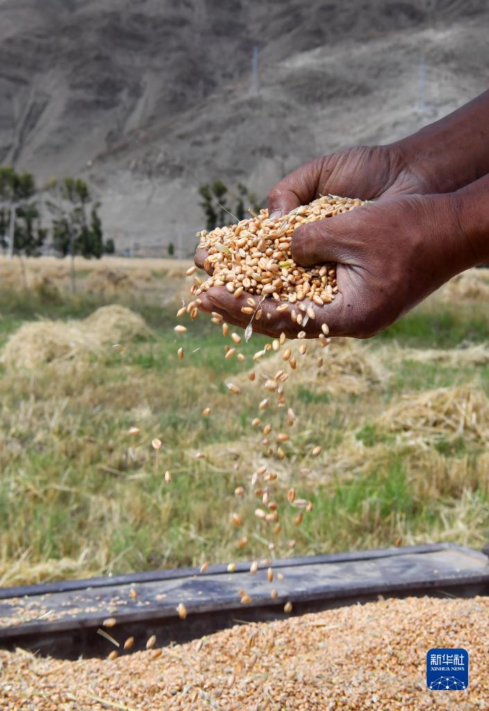 林周縣邊林鄉當杰村玉沖組的村民在檢查收獲的小麥(9月6日攝)。