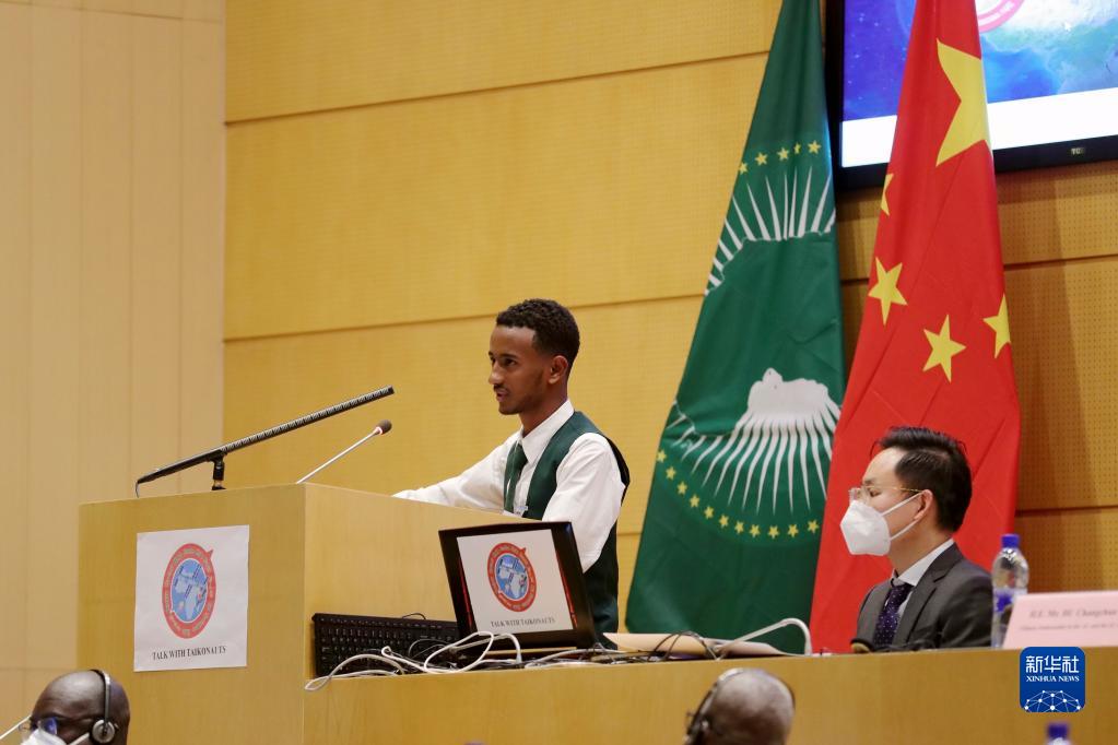 9月6日,在位于埃塞俄比亞亞的斯亞貝巴的非盟總部,一名埃塞俄比亞中學生在“天宮對話”活動中向中國航天員提問。