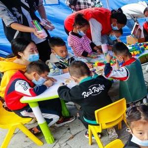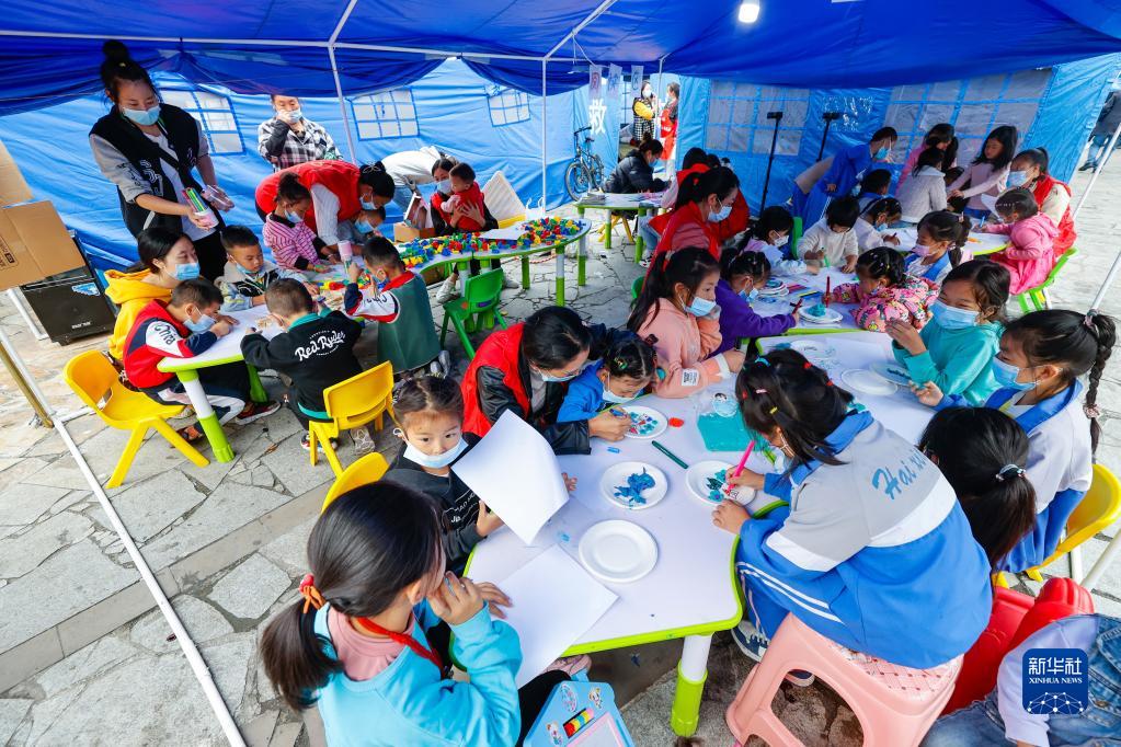 9月7日,在四川省甘孜州瀘定縣磨西鎮地震救災安置點,志愿者陪伴孩子們在青青兒童樂園做手工、玩玩具。