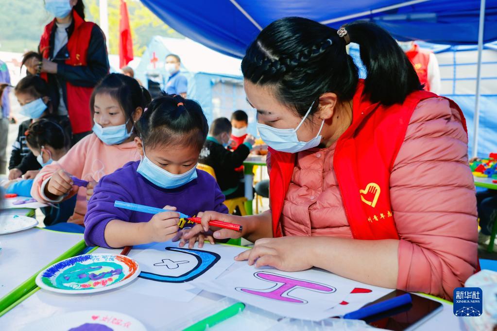 9月7日,在四川省甘孜州瀘定縣磨西鎮地震救災安置點,志愿者陪伴孩子們在青青兒童樂園畫畫、涂色。