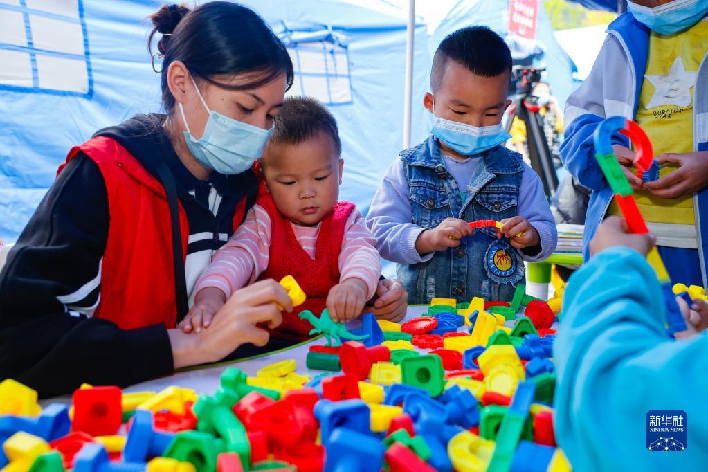 9月7日,在四川省甘孜州瀘定縣磨西鎮地震救災安置點,志愿者陪伴孩子們在青青兒童樂園玩玩具。